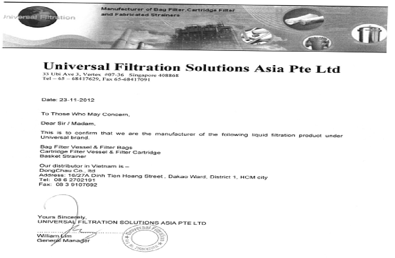 Chứng thư xác nhận Công ty Môi trường Đông Châu là nhà Phân phối chính thức các sản phẩm lọc chất lỏng của Universal Singapore tại Việt Nam.